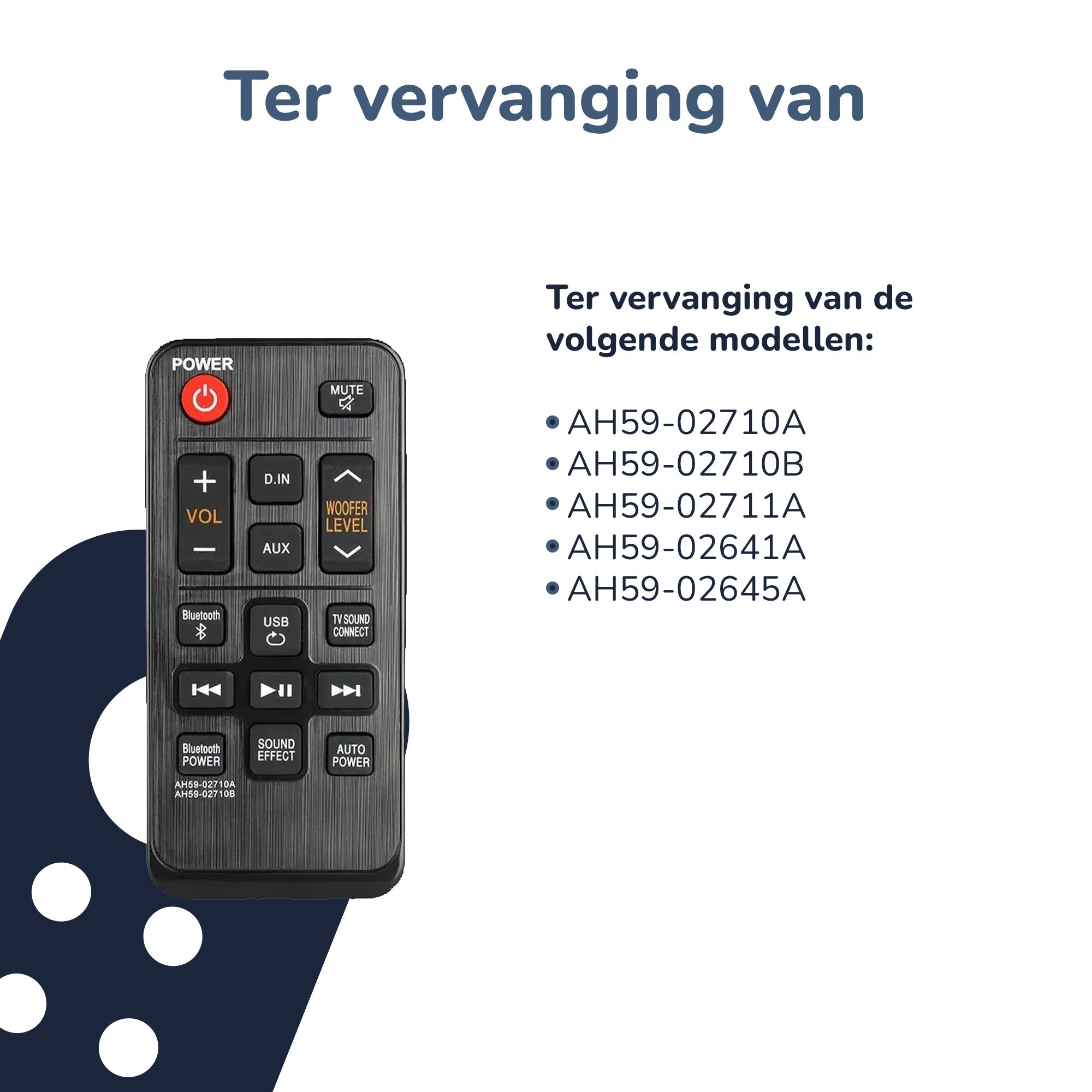 Deze vervangende afstandsbediening is speciaal ontworpen voor diverse Samsung soundbars. Hierdoor is dit een betrouwbare oplossing wanneer uw originele afstandsbediening niet meer werkt of kwijt is. Zo hoeft u geen complete soundbar te vervangen en bespaart u kosten.